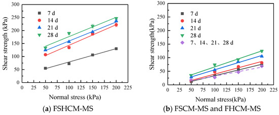 Figure 4 illustrates the representative strength envelopes of samples treated by the three methods. It should be noted that the solid lines represent FSCM and the dashed lines represent FHCM in Figure 4b. With the increasing curing age, the shear strength envelopes of FSHCM-MS and FSCM-MS moved upward, indicating an increase in shear strength. Additionally, the shear strength envelope of FHCM-MS remained unchanged with curing age. The shear strength envelope of FSHCM-MS at 7 days was located above the shear strength envelope of FSCM-MS at 28 days, indicating that FSHCM-MS achieved greater shear strength in a shorter time. Compared to FSCM, FSHCM needed less composite solidification agent, and FSHCM-MS achieved higher shear strength, demonstrating the efficiency of FSHCM.