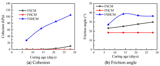 Figure 5 illustrates the effects of curing age on the cohesion and friction angle of samples treated by the three methods. It can be observed from Figure 5a that FHCM-MS exhibited no cohesion at 7 days, 14 days, 21 days, and 28 days of curing. This was attributed to the higher water content in FHCM-MS, which did not allow effective bonding between soil particles. FSCM-MS exhibited no cohesion at 7 days and 14 days of curing age, and it showed minimal cohesion at 21 days, which gradually increases with the curing period. After flocculation and dewatering treatment, there were still numerous pores between soil particles in the slurries. Under the influence of the composite solidification agent, it was challenging to establish effective bonds between soil particles in a short period. The cohesion of FSHCM-MS increased with curing age. Compared to FHCM-MS, the cohesion of FSHCM-MS increased by 104.89 kPa after 28 days of curing. Compared to FSCM-MS, FSHCM-MS saved 14% of the composite solidification agent dose and increased the cohesion by 94.59 kPa after 28 days of curing. From Figure 5b, it can be observed that the friction angle values for FSHCM-MS ranged from 20° to 38.5°, presenting significant advantages.