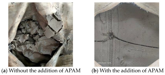 To investigate the effects of the APAM dose on the dewatering performance of FSHCM-MS, representative APAM doses (0%, 0.16%, 0.20%, 0.24%, and 0.28%) were selected for the analysis of the dewatering performance of the marine mud slurry. As shown in Figure 7 and Figure 8, the mud cake without the addition of APAM was fragmented, and the filtrate was turbid. When APAM was added, the mud formed into a cake shape, and the filtrate was clear.
