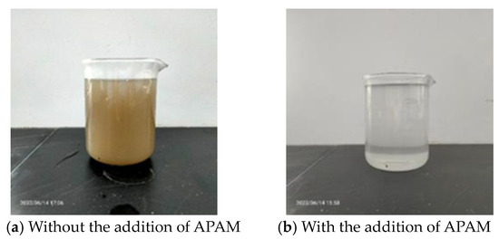 Figure 9 shows the effects of the APAM dose on the water content of the mud cake. When the APAM dose was 0.16%, the water content of the mud cake was only 65.56%. When APAM was not added, the water content of the mud cake was 150.6%, which was 2.3 times that of the mud cake without APAM, and the dewatering efficiency was significantly improved. Moreover, as the APAM dose increased, the water content of the mud cake decreased, but the rate became smaller.