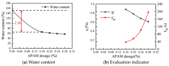 Additionally, mechanical stirring time was considered as another evaluation indicator. The mechanical stirring time was the mixing time of the agitator after adding the APAM solution to the mud slurries. The shorter the mechanical stirring time, the greater the mud volume that could be processed per unit time. The effects of APAM dose on evaluation indicators are shown in Figure 9b. It can be observed that with an increase in APAM dose, the value of η exhibited a generally linear decrease, while the mechanical stirring time (tm), showed an exponential increase. The results indicate that as the APAM dose increased, the investment cost of FSHCM increased. Therefore, this study recommends an optimal APAM dose of 0.16%.