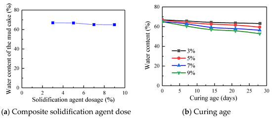 Figure 10 illustrates the effects of composite solidification agent dose on the water content of the mud cake. As seen in Figure 10a, the initial water content of the mud cake showed relatively small variations with changes in the dose of the composite solidification agent, and the dose of the composite solidification agent had little effect on the dewatering efficiency of the FSHCM. Figure 10b shows that with an increasing curing age, a higher solidification agent dose resulted in a faster decrease in the water content of the mud cake. For example, when the solidification agent dose was 3%, 5%, 7%, and 9%, the 28-day water content of the mud cake was 63.15%, 59.47%, 56.28%, and 52.84%, respectively.