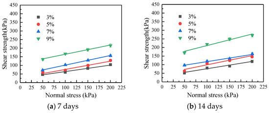 Figure 11 illustrates the effects of the dose of the composite solidification agent on the shear strength of mud cakes. It can be observed from Figure 11a that samples with a higher dose of composite solidification agent had shear strength envelopes positioned above those with a lower dose. Under the same normal stress conditions, they exhibited greater shear strength.