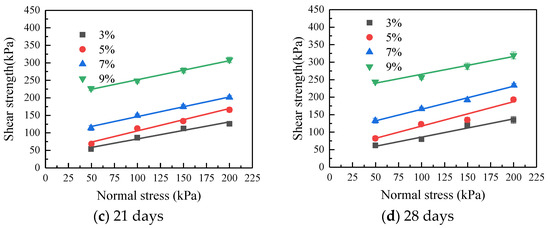 It can be observed from Figure 11 that the shear strength of the samples increased with the curing age. Using the experimental results with a normal force of 200 kPa as an example, when the samples were cured from 7 days to 28 days, the shear strength of the samples increased by 30.2 kPa, 64.12 kPa, 76.13 kPa, and 104.45 kPa, respectively, for composite solidification agent doses of 3%, 5%, 7%, and 9%. The higher the dose of the composite solidification agent, the faster the increase in the shear strength of the samples with curing age, and the greater the ultimate shear strength.