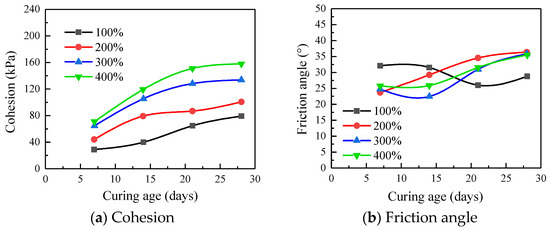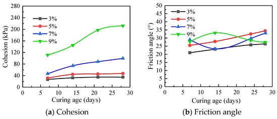 The Mohr–Coulomb criterion can be used in direct shear tests. Figure 12 illustrates the effects of the dose of the composite solidification agent on the cohesion and friction angle of the samples. As shown in Figure 12a, the cohesion of samples increased with curing age, and a higher dose of composite solidification agent resulted in a more pronounced increase in cohesion. For the same curing age, samples exhibited greater cohesion with a higher dose of composite solidification agent. As can be seen from Figure 12b, the values of the friction angle ranged between 20° and 35°.