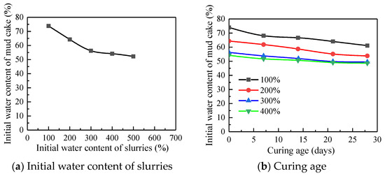 It can be observed from Figure 13b that for a given dose of composite solidification agent, the higher the initial water content of the marine mud slurry, the lower the 28-day water content of the mud cake. Specifically, when the initial water content of the marine mud slurry was 100%, 200%, 300%, and 400%, the 28-day water content of the mud cake was 61.0%, 53.8%, 49.5%, and 48.7%, respectively. The reasons for this phenomenon include the following two points. The main reason is that as the initial water content of the marine mud slurry increased, there were fewer solid particles per unit volume, resulting in a higher initial porosity. This led to shorter drainage paths and higher drainage rates. Another possible reason is that the chosen APAM dose for this experiment (0.12%) was optimal for mud with high water content. At this dose, the dewatering performance was better in high-water-content samples compared to low-water-content samples.