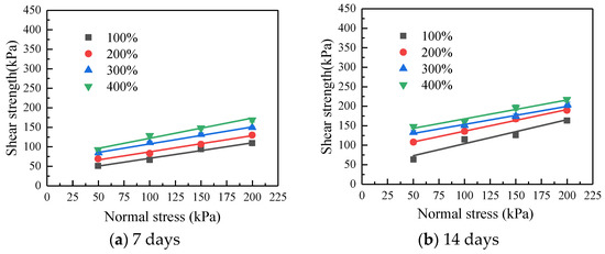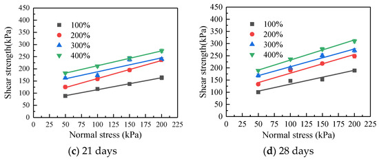 Furthermore, the shear strength of the samples increased with curing age. Taking the normal stress of 200 kPa as an example, for samples cured from 7 days to 28 days, the shear strength increased as follows for the marine mud slurry with the initial water content of 100%, 200%, 300%, and 400%: 79.67 kPa, 117.77 kPa, 123.2 kPa, and 130.75 kPa, respectively. The higher the initial water content of the marine mud slurry, the faster the rate of increase in shear strength of the samples with curing age, resulting in a higher final shear strength value.