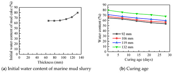 Figure 16 illustrates the effects of the initial thickness of the geo-bags on the initial water content of the mud cake. It can be observed from Figure 16a that as the initial thickness of the geo-bags increased, the initial water content of the mud cake remained relatively constant at first and then gradually increased. Specifically, the water content of the mud cake rose by 14.8% due to the increase in the initial thickness of the geo-bags from 92 mm to 132 mm, while it remained almost unchanged from 66 mm to 92 mm. Figure 16b illustrates the effects of the curing age on the water content of mud cake. When the same dose of composite solidification agent was used, a smaller initial thickness of geo-bags resulted in a lower 28-day water content of the mud cake, mainly because the former led to shorter pore channels and better dewatering efficiency in the FSHCM.