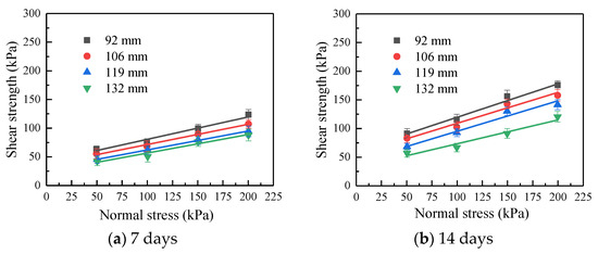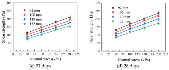 Furthermore, with the increase in the curing age, the shear strength envelope gradually shifted upward, indicating that the shear strength of the mud cake increased with the curing age. Taking the normal stress of 200 kPa as an example, as the curing period increased from 7 days to 28 days, the shear strength of the samples increased by 114.48 kPa, 109.35 kPa, 92.2 kPa, and 74.86 kPa under the geo-bag thickness of 92 mm, 106 mm, 119 mm, and 132 mm, respectively. The results show that under the same normal force, the greater the initial thickness of the geo-bags, the smaller the increase in shear strength of mud cake with the change in curing period.