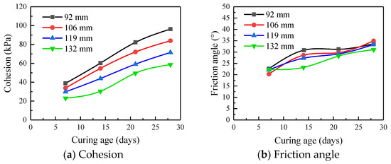 Figure 18 illustrates the effects of the initial thickness of the geo-bags on the cohesion and friction angle of the samples. As seen in Figure 18a, under the same curing age, a smaller thickness resulted in greater cohesion of the mud cake. Under the same geo-bag thickness, the cohesion of the mud cake increased with the increase in curing time. When the curing period increased from 7 days to 28 days, the cohesion of samples increased by 62.05 kPa, 51.79 kPa, 46.91 kPa, and 36.38 kPa under the geo-bag thickness of 92 mm, 106 mm, 119 mm, and 132 mm, respectively. Figure 18b depicts the variation in the friction angle. Under the same geo-bag thickness, the friction angle increased with the increase in curing age. The maximum value of the friction angle was 35°, and the minimum value was 20°.