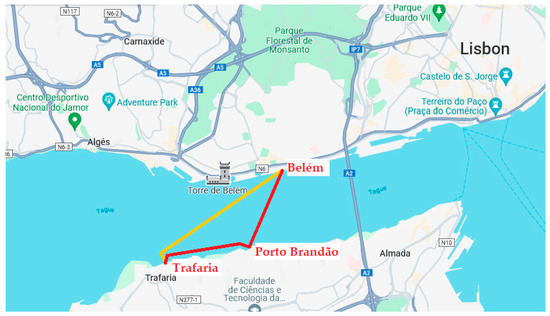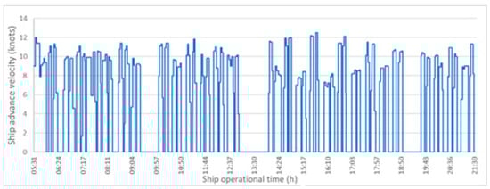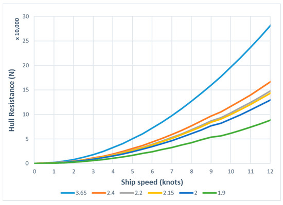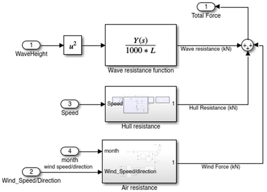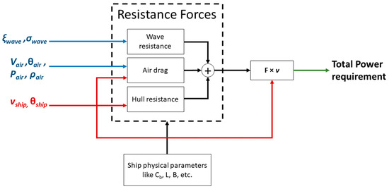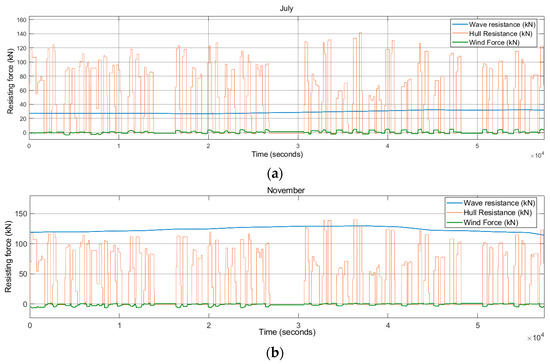 B corresponds to the breadth of the ship. For the simulation performed in this study, the average of each month is used for every second of the ship’s operational day. Similarly, the air resistance is governed via Equation (9) where the density of air varies each month of the year. This density depends on ambient temperature and pressure conditions: