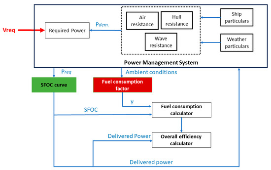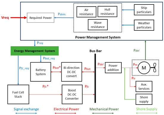 The PMS evaluates real-time conditions acting on the vessel, and their effects are compared with required power, i.e., the desired speed. After evaluation, as a result, its output is the net required power for the ferry to continue to propel at the set speed, which instructs the energy producers either to increase or decrease the power. This is accomplished in simultaneous stages by performing simultaneous calculations. The PMS calculates the difference between the delivered power and the power opposing the propulsion ship due to environmental forces (namely, wave and wind forces and air resistance).