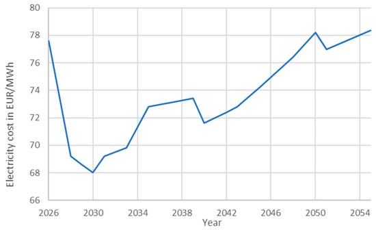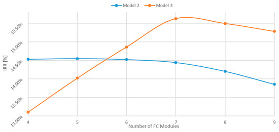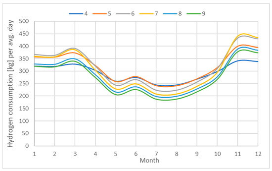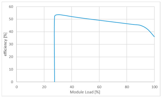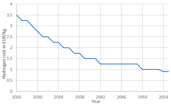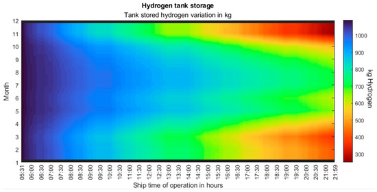 The FC module generates varying voltage and current outputs, necessitating the use of a DC–DC boost converter to maintain a constant voltage for the propulsion motor. Multiple simulations were conducted, altering the number of FC modules to determine the optimal module numbers. A crucial determining factor is the annual hydrogen consumption, directly influencing the operating expense (OPEX). To calculate the hydrogen used, the hydrogen mass flow is required, which is calculated during the simulation for every simulation step using Equation (2):