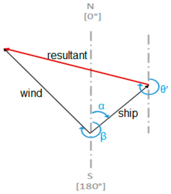 is the resultant velocity of incoming wind. This velocity is relative to the actual wind speed and direction in addition to the ship’s speed and direction. This resultant wind velocity and direction is calculated as a vector product of both the velocities as represented in