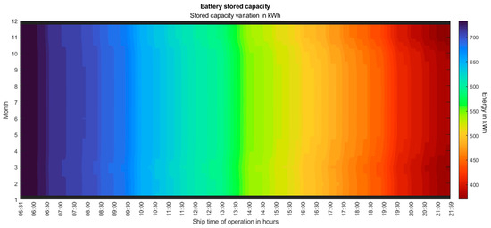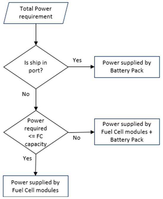 Apart from the power requirement of the propulsion, the power system in this study is also designed to supply energy to the ship’s auxiliary demands. The auxiliary system includes all the necessary equipment like communication, navigation, fire management systems, etc., along with all the devices required for comfortable movements of crew and passengers like air conditioning system, lighting, power ramps, etc. This study assumes that this power is fixed at a constant value of 50 kW. The power supplied while in port is sourced from a battery power pack. In the designed hybrid power system, if the number of FC modules is less (while using a simulation to track different module numbers) but there is a higher power demand exceeding FC capacity, the battery pack supplements the FC system for propulsion. This leads to an increase in the battery size to accommodate the combined power needs. Apart from this, the battery also provides interim power until the FC catches up. Equation (3) represents the total power available in the bus bar where