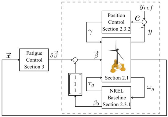 As shown in the figure, the NREL 5 MW OC4 WT is connected to three sub-controllers, that is, NREL baseline controller for (O1), position controller for (O3), and then fatigue controller for (O2). Next, each controller block will be explained in order. Note that our contribution in this paper is the fatigue controller block, and the other two blocks will be presented below for review purposes only.