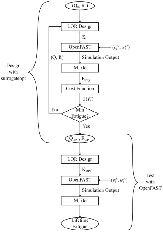 First, we give the initial optimization variables, denoted by . This, in combination with the linearized model in Section 3.1.2, will lead to the initial linear quadratic regulator gain . This controller gain is used for simulations with various wind and wave profiles in the medium-fidelity wind turbine simulator OpenFAST [32]. The simulation results are input to the fatigue load calculation software MLife [34], and the objective function in (7) is evaluated. Based on the evaluated objective function, the surrogate optimization algorithm, implemented by the Matlab command surrogateopt.m, will update the weighting matrices . The rationale for adopting the surrogate optimization is that it can deal with the optimization of computationally expensive objective functions. The objective function being evaluated here requires running multiple simulations per optimization iteration, leading to long evaluation times. The algorithm will be terminated when either the fatigue is not reduced compared to that in the previous iteration, or the pre-specified maximum number of iterations is reached.