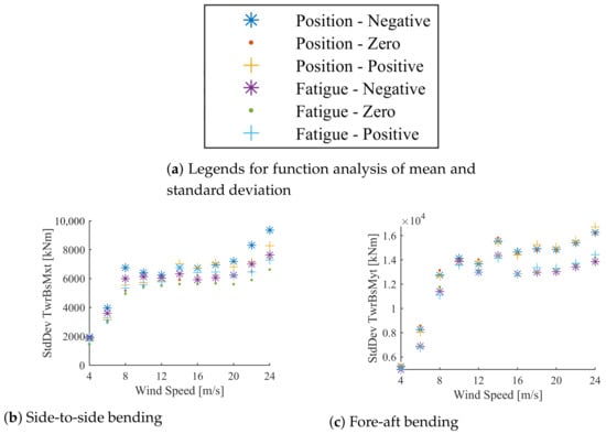 Fatigue is attributed to three features characterizing the structural oscillations, that is, the mean of each load cycle, the range of each load cycle and the number of cycles. It turned out that the designed controller primarily reduced the range of each load cycle, which led to the reduced fatigue. This reduced range can be seen in Figure 7, which shows the standard deviation of the bending load about the tower base in the x and y directions. We can see that for each wind speed and movement direction the standard deviation was reduced, indicating that the load oscillations became smaller.