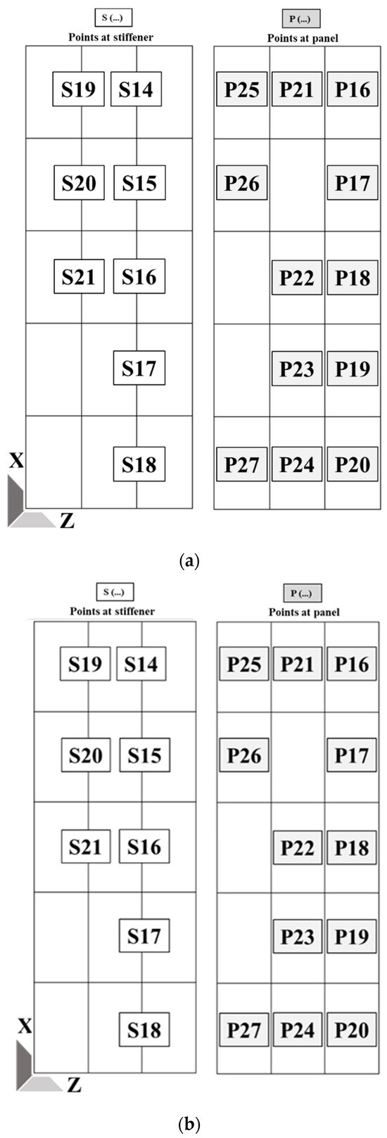 In general, the bearing capacity of the plate and the stiffener on a stiffened plate is different [31]. The failed points on the stiffener and the failed points on the plate have different correlations with moment identification. To this end, in this study, the located structures of failed points are divided into two types: plate and stiffener. As shown in Figure 10, six failure conditions were designed to investigate the correlation between measuring points at different structures and identification accuracy.
