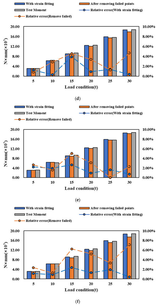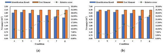 The identification results and relative error of different conditions are shown in Figure 11. Among the identification results of conditions a to c, the relative error in condition a is the lowest, whereas condition c exhibits the highest relative error. This indicates that the measuring points located on the deck stiffener have a more pronounced influence on the accuracy of moment identification compared to those on the deck plate. Similarly, when examining the identification results of conditions d to f, it becomes evident that condition d displays the highest relative error, whereas condition f demonstrates the lowest relative error. This suggests that the measuring point on the side plate exhibits a stronger correlation with the identification of the bending moment as compared to the measuring point on the side stiffener. Furthermore, the relative error observed in conditions a to c is greater than that observed in conditions d to f, which further substantiates that the deck measuring points are more strongly correlated with the accurate identification of the bending moment.