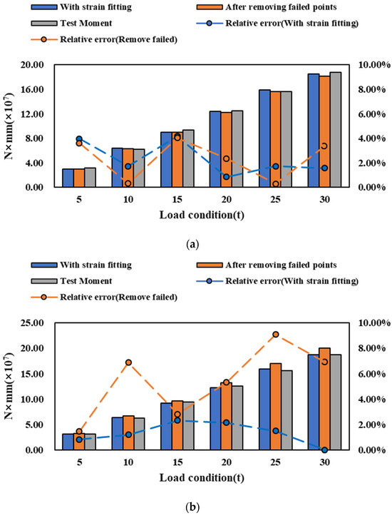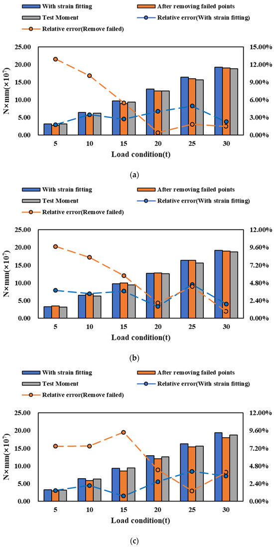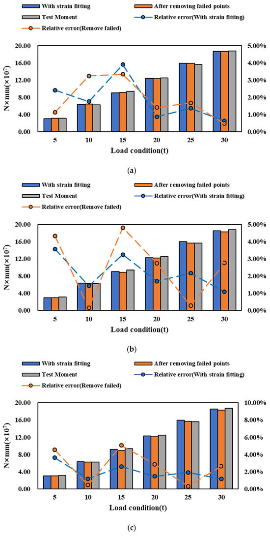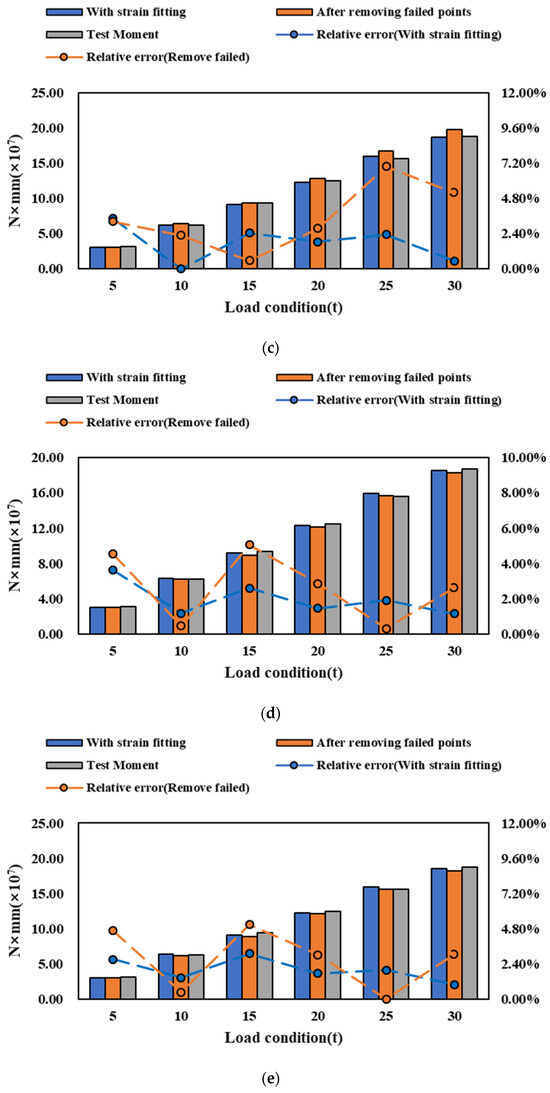 Figure 5a–e present the results of the longitudinal bending moment identification, along with the corresponding relative errors, for various load conditions ranging from 5t to 30t. The sectional interval between each measurement is set at 200 mm. The maximum relative error of the identification result is less than 4%, while the average relative error is calculated to be 2.3%. These identification errors stem from the deviation between the strain measuring value and the simulated value. During the experiment, due to the existence of unavoidable geometric defects in the structure and interference from the practical environment, the deviation of the strain value is hard to be eliminated. In this study, the identification error is very low. This indicates that the accuracy of strain measurement is within an acceptable range, and the longitudinal moments can be accurately identified in the practical scenario.