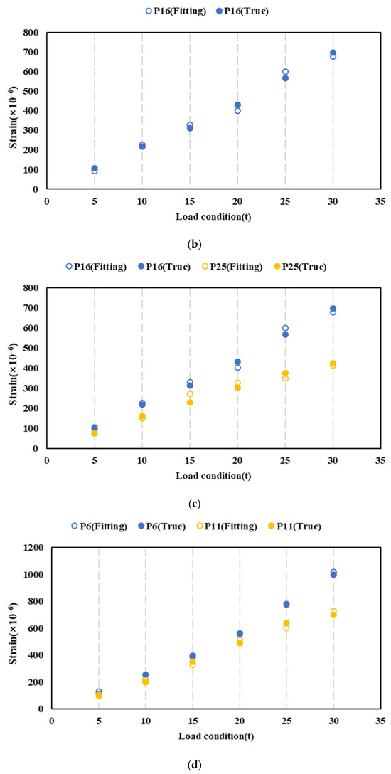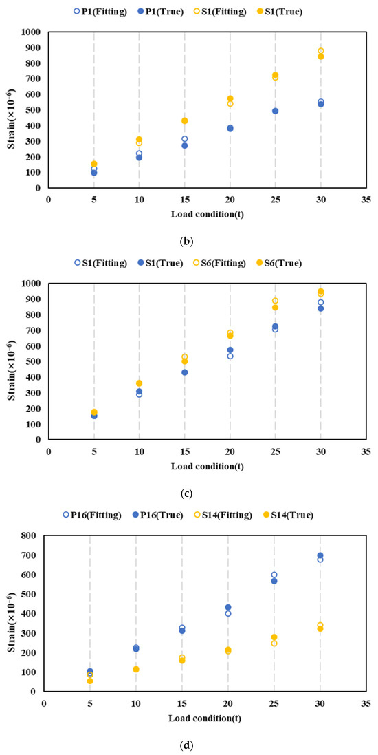 In particular, it should be pointed out that the XGboost fitting method operates on the principle of reducing the influence of adjacent outlier values on the fitted points. This principle has been substantiated by the fitting results obtained from our experimental and numerical investigations. As shown in Figure 12a–d, a comparison of the fitting outcomes under small-scale failure conditions (conditions a and d) reveals that the fitted strain value of P11 remains nearly unchanged even after the failure of P6 (which is in close spatial proximity to P11). Due to the existence of initial defects in the experimental model, the strain value at P6 differed from that at P11, ultimately leading them to be assigned to separate groups of value during the training regression model. The numerical results also present similar observations. For instance, as depicted in Figure 26, despite P11 and S14 being the closest points to the failed point P16, the fitting value of P16 aligns more closely with the corresponding point in the adjacent section. Due to the fact that P11, P16, and S14 are situated on distinct structures, significant disparities in stress components exist among these three positions under combined bending and torsion conditions, thereby hindering their regression into the same group of strain values. This characteristic of the XGboost fitting method mitigates interference from neighboring outliers during the fitting process of failed points. In summary, the XGboost fitting method not only fulfills the demands of local fitting but also exhibits robustness which is suitable for strain fitting.