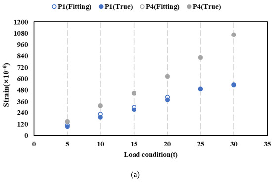 The strain fitting results under different training conditions are shown in Figure 26. As the strain fitting point value is almost consistent with the true value based on schemes 2 to 5, we just show one figure. Meanwhile, the fitting value displays an undeniable error based on scheme 1. This indicates that only two measurement points from the section are needed to accurately fit the failed points on a failure section. In other word, scheme 2 appears to be the optimal choice, taking into account the quest for the number of measurement points balanced against the required fitting accuracy.