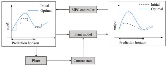 Model predictive control (MPC) is becoming increasingly prevalent in advanced control due to its direct formulation and powerful optimization capabilities to handle explicit models and constraints effectively. As shown in Figure 2, the MPC utilizes a closed-loop control structure, comprising the controller module equipped with the dynamic optimizer, plant model, cost function, and constraints [39]. Furthermore, Figure 3 demonstrates the open-loop control in the MPC controller. The plant model serves as a simplified estimate of the actual plant, aiding in the optimization process. The control system’s initial inputs operate within a predetermined range and are supplied to the plant model. The initial output of the model is suboptimal. Moreover, the MPC controller aims to optimize the control inputs based on the appointed cost function. Over various iterations, the control inputs gradually converge to the optimum solution. The improved control inputs should be installed in the physical installation to bring it up to date. The optimization cycle repeats for each subsequent prediction time span, within the new redirection time span. This process continues until the time span concludes. The MPC controller design is achieved by model predictive controller toolbox. The user outlines the core components of the numerical model, including the cost function, state space, and constraints. The remaining unspecified modules are predetermined by default settings, such as the dynamic optimizer.