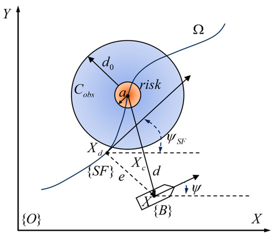 This paper assumes that the sensors have identified the position, size, and configuration of obstacles. As illustrated in Figure 4, the risk model depicting the correlation between the USV and the obstacles has been established based on the SFC. The mass center of the USV is denoted by , also serving as the origin of the {B} coordinate, coinciding with the desired track point , i.e., the origin of the SFC. This coordinate system reflects the orthogonal projection of on the target track on the system and shifts alongside the motion of the USV. is the distance between and , is the target heading, and is the heading angle of the USV. is the maximum distance at which the risk can affect the movement of the USV, where denotes the radius of a circular obstacle (i.e., the red obstacle region). If the obstacle is irregular, we approximate it as a circular obstacle. is the safety coefficient which depends on the operating performance of the USV and the shape of the risk and is generally taken as 5~10, is the distance between the mass center of the USV and the center of the blue risk area .