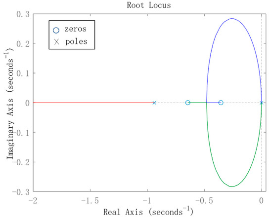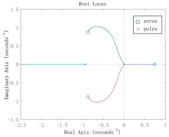 To ensure the system converges quickly, it is important to consider the impact of the output matrix on the system’s zeros since their position affects convergence speed. Therefore, it is necessary to further analyze the impact of the output matrix on the system convergence performance. A reasonable output matrix can be designed to ensure stability as the dynamic characteristics of the system derived from the rudder angle to the rolling is a kind of non-minimum phase system by dynamics’ analyses. Specifically, if , i.e., taking all state variables of the system as output, the root trajectory of the transfer function of the system is shown in Figure 5.