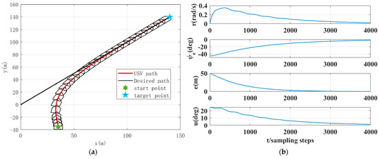 Simulation results for target point following. (a) USV path simulation result with target point at ; (b) simulation results for yaw velocity, heading error, tracking error, and controller output for target point following.