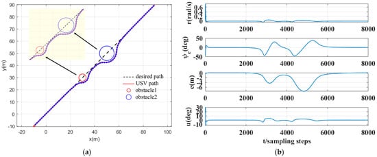 Simulation results for multiple obstacles. (a) USV path simulation result with multiple obstacles at and ; (b) simulation results for yaw velocity, heading error, tracking error, and controller output for trajectory tracking with multiple obstacles.
