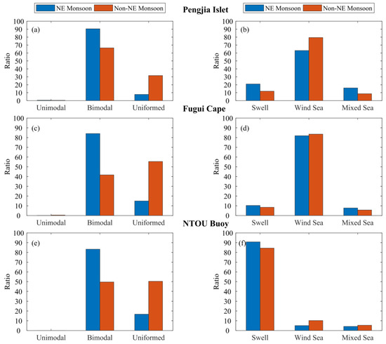 The ratio of wave type in the different stations: (a,b) Pengija Islet; (c,d) Fugui Cape; (e,f) NTOU Buoy.