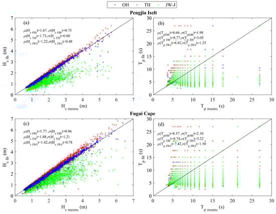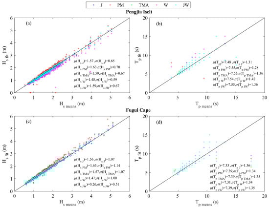 Comparison of Hs and Tp of each fitting model and measured results for unimodal wave spectrum: (a,b) Pengjia Islet; (c,d) Fugui Cape.
