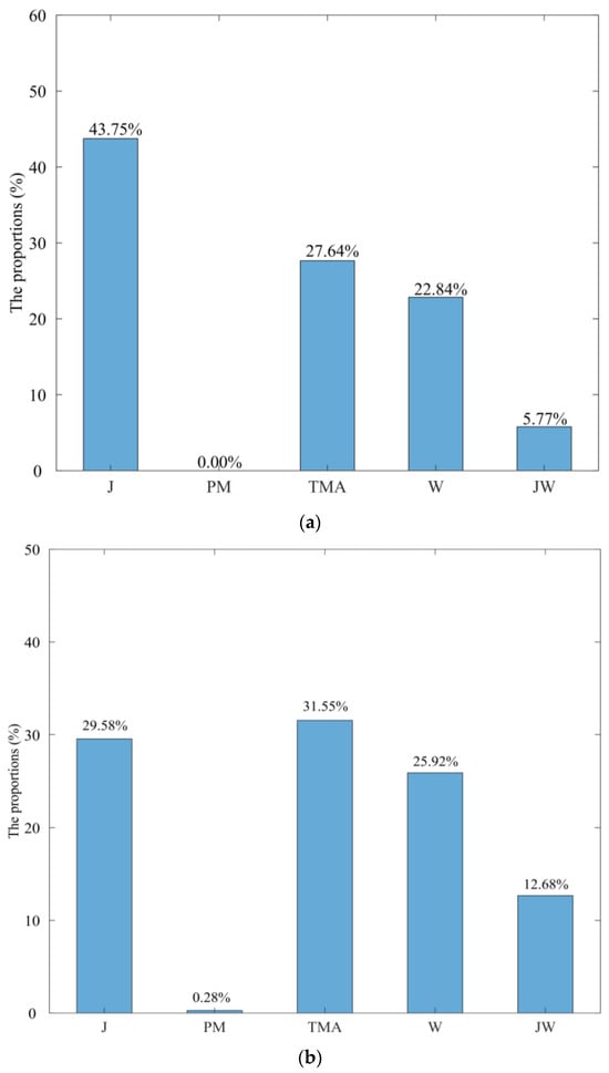 Figure 4a,b illustrate the proportions of the best-fitting wave spectrum models for the Pengjia Islet and Fugui Cape stations, respectively. Figure 4a shows that the JONSWAP wave spectrum model best fits the Pengjia Islet station, accounting for 43.75% of the total, because this station is located closer to the open sea, where wind-driven waves predominantly influence the conditions. On the other hand, Figure 4b shows the results for the Fugui Cape station, where the TMA wave spectrum model is predominant in the best-fitting results (31.5%). Owing to the station’s proximity to the nearshore area, the limited water depth makes the TMA wave spectrum model a better fit for the observed data.