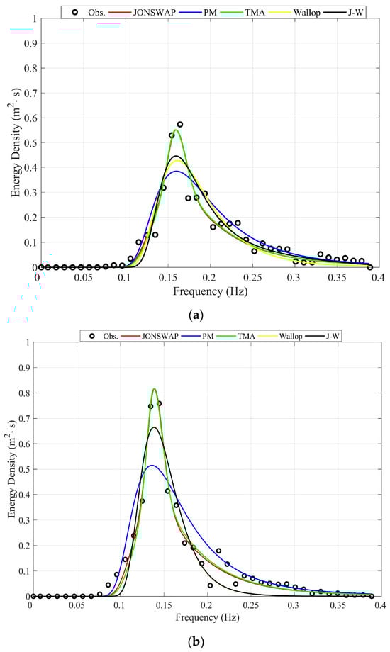 Figure 5a,b present the fitting results of different unimodal wave spectrum models at the Pengjia Islet and Fugui Cape stations, respectively. The results indicate that, for the Pengjia Islet station, the JONSWAP wave spectrum better describes the variations in the wave spectrum. For the Fugui Cape station, the JONSWAP and TMA wave spectrum models provide better descriptions of the fitting results. The integrated areas of the observed values and various spectral models were compared to investigate the differences among spectra further. After integrating the results from the Pengjia Islet station in Figure 5a, the area of the observed spectrum is 0.0390 Hz·m2s. The integrated areas for the JONSWAP, PM, TMA, Wallop, and JW models are 0.381, 0.381, 0.381, 0.355, and 0.366 Hz·m2s, respectively. Figure 5b at the Fuguei Cape station shows the observed spectrum area of 0.448 Hz·m2s. The corresponding integrated areas for the JONSWAP, PM, TMA, Wallop, and JW models are 0.427, 0.427, 0.427, 0.372, and 0.372 Hz·m2s, respectively. The above results show that the JONSWAP, PM, and TMA models provide results closest to the observed values. However, while consistent with the other two models, the PM model exhibits lower sharpness, resulting in an overall lower correlation than the other two models. Although the JW model showed relatively good fit percentages of 5.77% and 12.68% in Figure 4, its performance in comparing integrated areas with observed values is relatively poor.