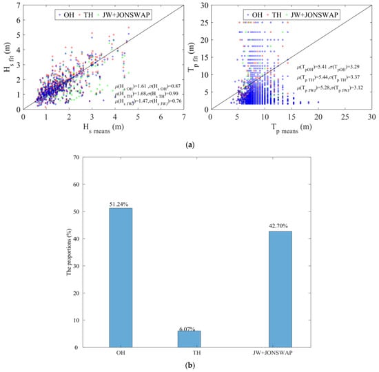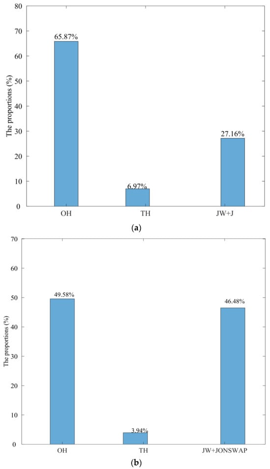 Figure 7a,b illustrate the proportions of optimal fitting results for each bimodal wave spectrum model at the Pengjia Islet and Fugui Cape stations. From the results in Figure 7a, it can be observed that the optimal spectrum model for Pengjia Islet is OH, accounting for 65.87%. The proposed JW-J spectrum in this study represents 27.16%. Owing to the deeper water depth in this region, the influence of nearshore conditions is less pronounced, and it aligns with the assumption of the OH spectrum that sea surface fluctuations follow a Gaussian distribution. For the Fugui Cape station (see Figure 7b), although the OH spectrum still dominates the optimal fitting results at 49.58%, the proposed JW-J spectrum is close behind at 46.48%. The reason may be that the station is located closer to the coast, where the JW-J spectrum better describes the characteristics of low-frequency waves in different wave stages, resulting in a good fit. The TH spectrum represents only 6.97% and 3.94% at the two stations, consistent with previous research findings [15]. Despite the TH spectrum being validated with measured data on the Norwegian coast, its model parameters may need adjustment for different regions to achieve better fitting results.