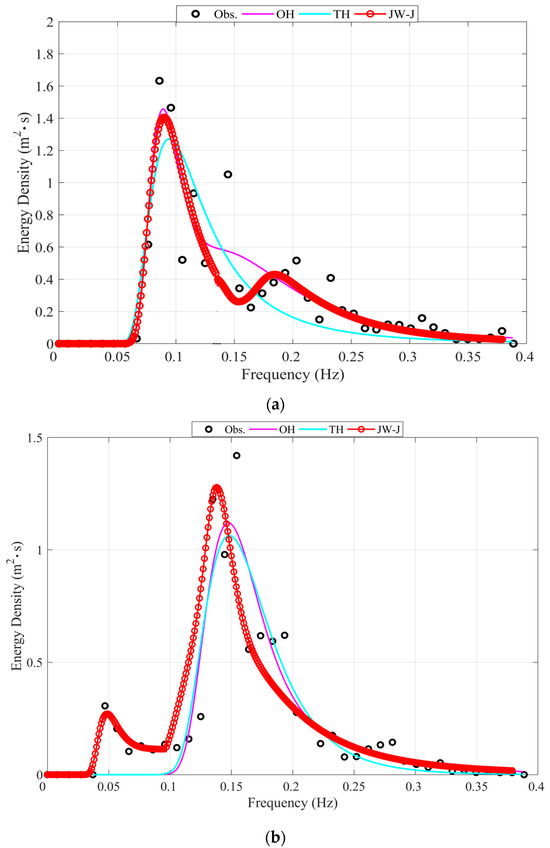 Figure 8a,b present the fitting results of different bimodal wave spectrum models at the Pengjia Islet and Fugui Cape stations. In the case of Pengjia Islet, the wind-wave system has more energy, and the energy of the swell system is relatively weaker. Figure 8a shows that OH and JW-J spectra closely match the measured data. In contrast, the TH spectrum tends to be underestimated, especially in the high-frequency (wind wave system) part. For the Fugui Cape station, the energy of the swell system is relatively stronger, and the wind wave system is weak. According to the results in Figure 8b, the OH spectrum effectively captures the variations in the measured spectrum. However, there needs to be more underestimation in the high-frequency (wind wave system) part. The JW-J spectrum effectively fits the measured data at low and high frequencies, while the TH spectrum exhibits an overall underestimation trend.