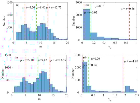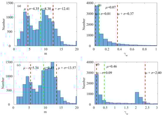 The statistics distribution of the shape parameter m and the peak enhancement factor γω during non-northeast monsoon: (a,b) in Pengjia Islet, (c,d) in Fugui Cape.