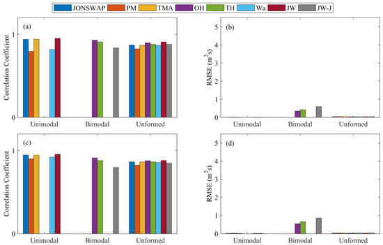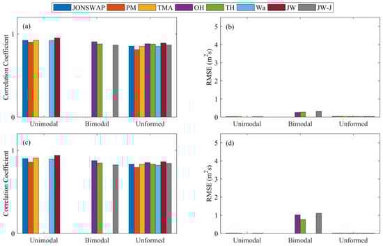 Figure 12a shows the correlation coefficients (cc) and root mean square error (rmse) results when applying different spectrum models to the Pengjia Islet station. For the unimodal spectrum, the JONSWAP spectrum (blue column) and JW spectrum (dark red column) perform the best (cc of 0.925 and 0.955 and rmse of 0.028 m and 0.022 m, respectively). In the case of bimodal spectra, the OH spectrum (purple column) exhibits the best performance with cc and rmse values of 0.906 and 0.258 m. The JW-J spectrum (gray column) has cc and rmse values of 0.867 and 0.326 m, respectively.