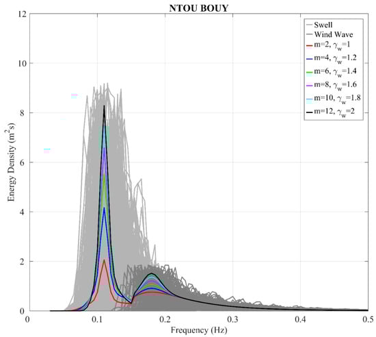 Figure 14 illustrates the variation of the JW-J spectrum with fixed parameters. The light gray and dark gray backgrounds represent the energy spectrum distribution of the swell and wind wave systems at the NTOU wave buoy. It can be observed that the energy of swells is stronger in this region, consistent with the dominance of swells in the wave patterns. Regarding the parameters of the JW-J spectrum, the assumption of Hs is 1.0 m, and the Tp for swell and wind waves are 10 s and 5.6 s, respectively. The shape parameter (m) and the spectral peak enhancement factor (γw) range from 2 to 12 and 1 to 2. The fitting spectrum distribution can roughly contain the energy density of the wave buoy at the NTOU station. The wave characteristic parameters precisely fall within the range defined by the other two stations.