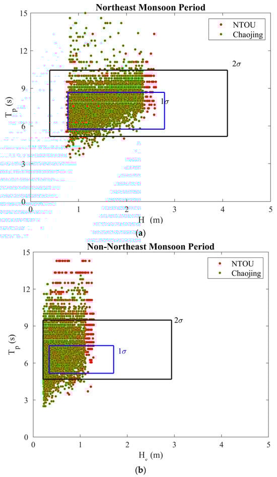 Application of parameter data from Pengjia Islet and Fugui Cape stations to NTOU buoy and Chaojing station during (a) the northeast and (b) non-northeast monsoon periods.