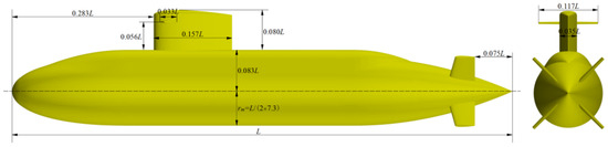 Figure 1 shows the Joubert BB2 submarine model with a length of L = 3.826 m and a model scale of 1:18.348. The hull was designed as an axisymmetric body of revolution with a length-to-diameter ratio L/2rm = 7.3, and the bow profile is derived from an NACA0018 curve [39], splined to allow the rise in pressure to occur further aft [20]. The cross-section of the sail is based on an NACA0022 with a height of 0.080L and a chord length of 0.157L. Two horizontal NACA0015 hydroplanes are assembled on the sail, and the combined span and the root chord were designed to be 0.117L and 0.033L, respectively. The stern control plane consists of four rudders in an X configuration, and the tailing edge is 0.075L away from the end of the hull. Further detailed descriptions can be found in Joubert [13,14], Bettle [21], and Overpelt [22].