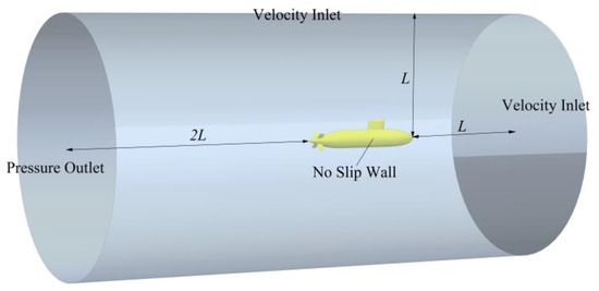 Figure 3 shows the cylindrical computational domain; the domain has a length of 4L and a radius of L, and extends from L upstream of the front of the hull to 2L downstream of the stern of the hull, to model a fully developed wake. Free-stream boundary conditions are imposed at the inflow and radial boundaries, and a pressure-outlet boundary condition is imposed at the outflow boundary. The no-slip wall treatment is used for shear stress specification.