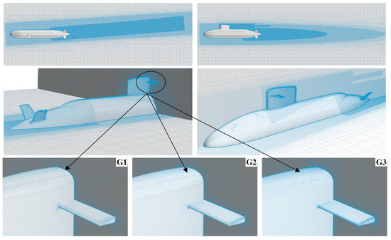 Figure 4 shows a diagram of the basic grid arrangement and the intuitive comparison of grid spatial resolution around the hydroplanes and sail under different grid sets. For capturing the flow field more accurately, a local volumetric control block was established around the submarine to control the surrounding grid size. Care was taken to resolve the initial vortex formation and roll-up of the free shear layer, and to avoid the rapid dissipation of the vortex structure in the wake of the sail, hydroplanes, and X-rudder; local volumetric control blocks were also established around these appendages for more refined volume mesh control. There is an angle of approximately 5.5 degrees between the blocks and the longitudinal axis of the hull in calculations under 10° yaw conditions.