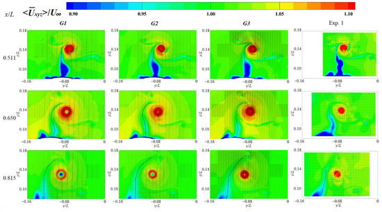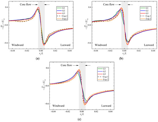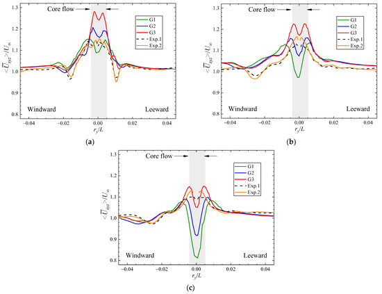 Figure 8 shows a comparison of the mean resultant velocity figures , as functions of radial distance ry/L from the vortex center, in the horizontal profiles through the sail-tip vortex. The mean resultant velocity under different grid sets exhibits a considerable difference, especially for the region of the core flow, which presents a corresponding increase with the grid number’s continuous growth. The core-flow velocity obtained from numerical calculations exhibits a significant difference at different axial distances from the bow, but is quite close for the experiments. The core flow obtained in the first set of grids (G1) has a mean velocity and at x/L = 0.511 and x/L = 0.815, respectively, with an axial descent rate of 18.8%. It corresponds to and , respectively, in G3, with an axial descent rate of 11.9%. This indicates that numerical attenuation inevitably exists in the LES simulations with the dynamic Smagorinsky model of the core flow, which is not advantageous compared to experiments, and can be partly eliminated by the improvement in the spatial resolution of the grid.
