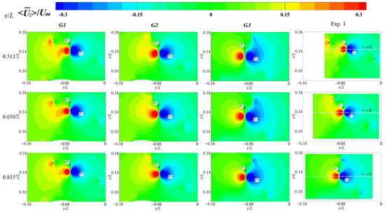 Figure 9 shows a comparison of the vertical component of velocity . It can be seen that the numerical results become gradually closer to the experimental values as the grid number increases. For the prediction of the peak and valley values, especially, the results obtained in G3 are quite close to those of Exp. 2, with a relatively higher Reynolds number. Overall, the relative errors of the peak and valley values in G3 are 10.6% and 4.3%, respectively, which becomes 13.2% and 14.0% in G2, and 21.6% and 21.1% in G1. It can be concluded that, with the refinement of the grids, the extreme values can be more accurately captured in numerical simulations due to the improvement in spatial resolution.