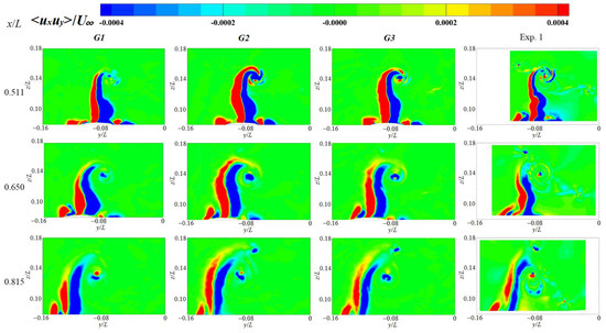 Figure 5, Figure 6 and Figure 7 provide a direct comparison of the wake of the cruciform appendage, including the mean resultant velocity , the vertical component of velocity , and the cross-stream Reynolds stress , where denotes the freestream velocity. The experimental results with ReL = 4 × 106 and ReL = 8 × 106 are denoted by Exp. 1 and Exp. 2, respectively. It can be observed that the sail-tip vortex formed by the rolling up of the wake can be presented by numerical calculations under all sets of grids. The region of the core flow, defined as a region of vortex flow from its center to its radial location of maximum swirl, is quite similar to the experimental results, while the range of the core flow and low-velocity region presents minor differences under different sets of grids. For the vertical component of velocity, in particular, as the number of grids increases, the distribution of high/low-velocity regions becomes more concentrated and obvious, and the numerical results become closer to the experiments. In addition, the numerical dissipation decreases as the grid number increases, and the capture of the cross-stream Reynolds stress seems to be more refined.