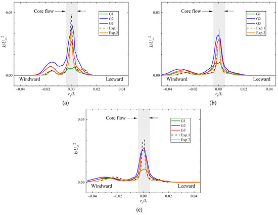 Figure 10 provides a plot of the comparison of the turbulence kinetic energy for the sail-tip vortex. The distribution of TKE along the radial distance ry/L for all grid sets is consistent with the experimental results, and the simulations of G3 are more representative of the experiments, with the relative error of the peak value in the region of core flow being relatively smaller.