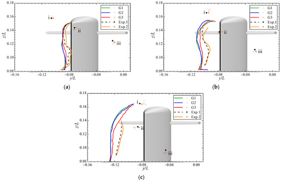 (a) x/L = 0.511; (b) x/L = 0.650; (c) x/L = 0.815. Comparison of the centerline of the sail wake under different sets of grids.